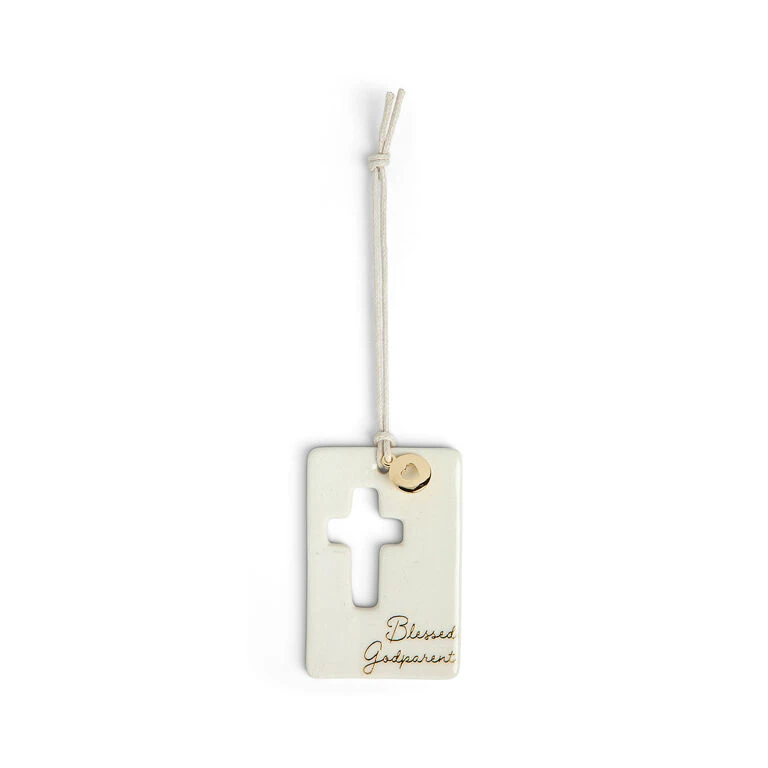 Commemorate a religious milestone moment in a charming way with this token for a godparent. This heirloom-quality ceramic token features a sweet message and cutout cross design, plus an open heart metal charm, and comes packaged in a windowed gift box with shredded paper padding. It makes a great gift for godparents at a baby’s baptism and can be displayed as an ornament or decoration with its cord hanger, included.